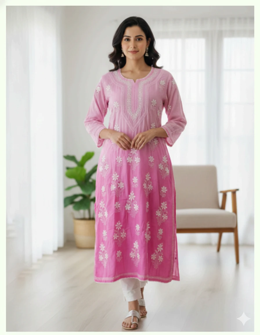 This sophisticated Ivory White Long Kurta is crafted from premium quality rayon, ensuring a soft and breathable feel. It features vibrant pink and green floral thread-work embroidery intricately detailed on the chest, bell-shaped sleeves, and front panel. Designed with a graceful round neckline and a delicate keyhole detail, this kurta offers a classic silhouette. Perfect for casual outings or festive gatherings, it combines traditional artistry with modern comfort. Priced at a special