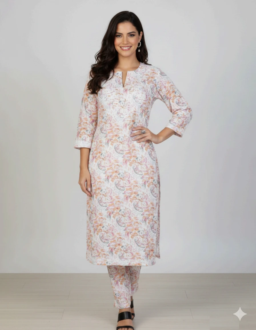 This elegant off-white kurta set features a delicate floral and paisley print in soft shades of peach, dusty rose, and lavender. The straight-cut tunic includes a notched neckline and three-quarter sleeves, paired with matching trousers. Its subtle, warm color palette creates a sophisticated and refreshing ethnic look.