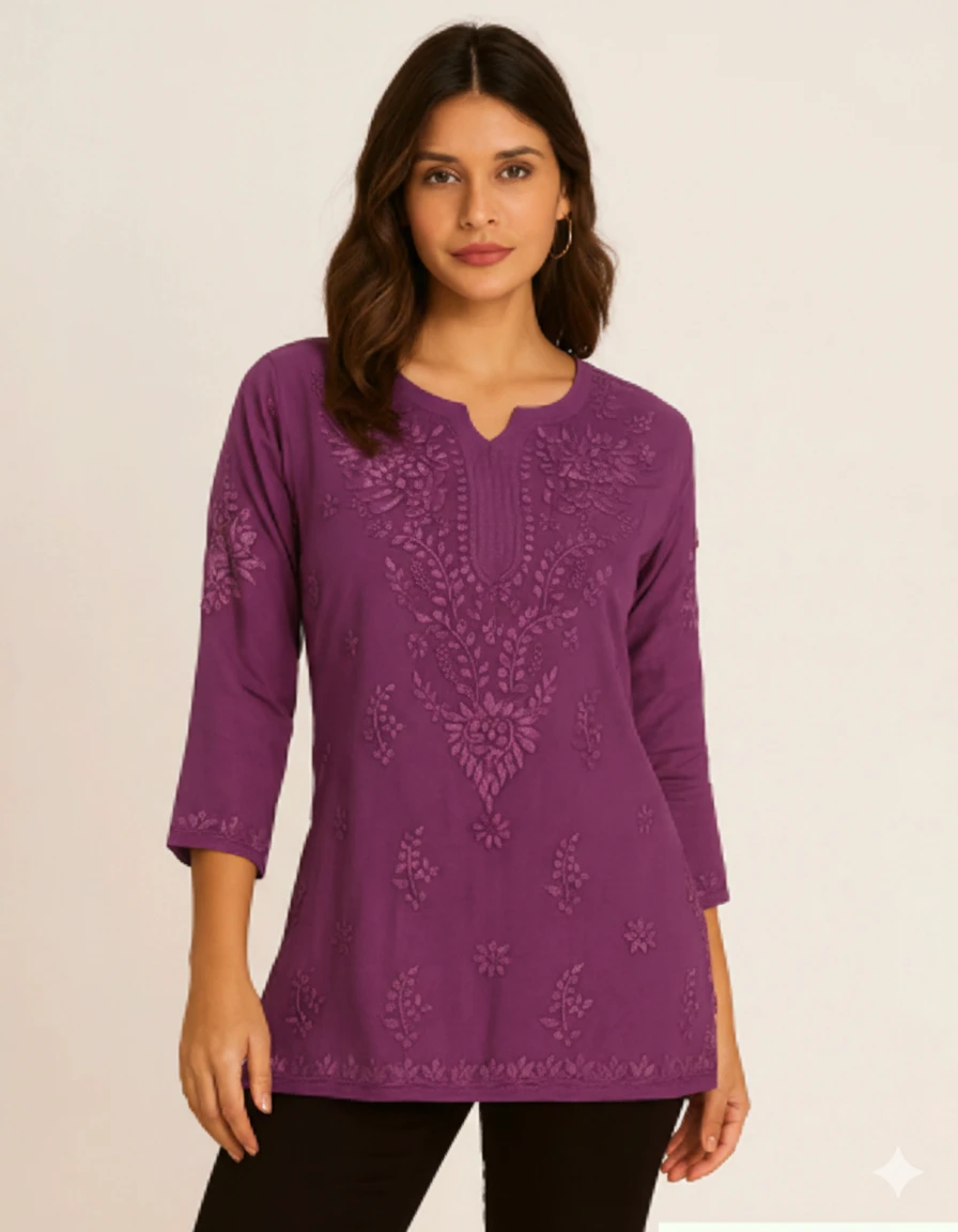 This elegant deep plum tunic showcases elaborate tonal Chikankari embroidery in a floral and vine motif across the front and sleeves. The high-definition design features a notched V-neckline and a relaxed fit, creating a rich, textured look. Its vibrant purple shade offers a modern and sophisticated ethnic aesthetic.